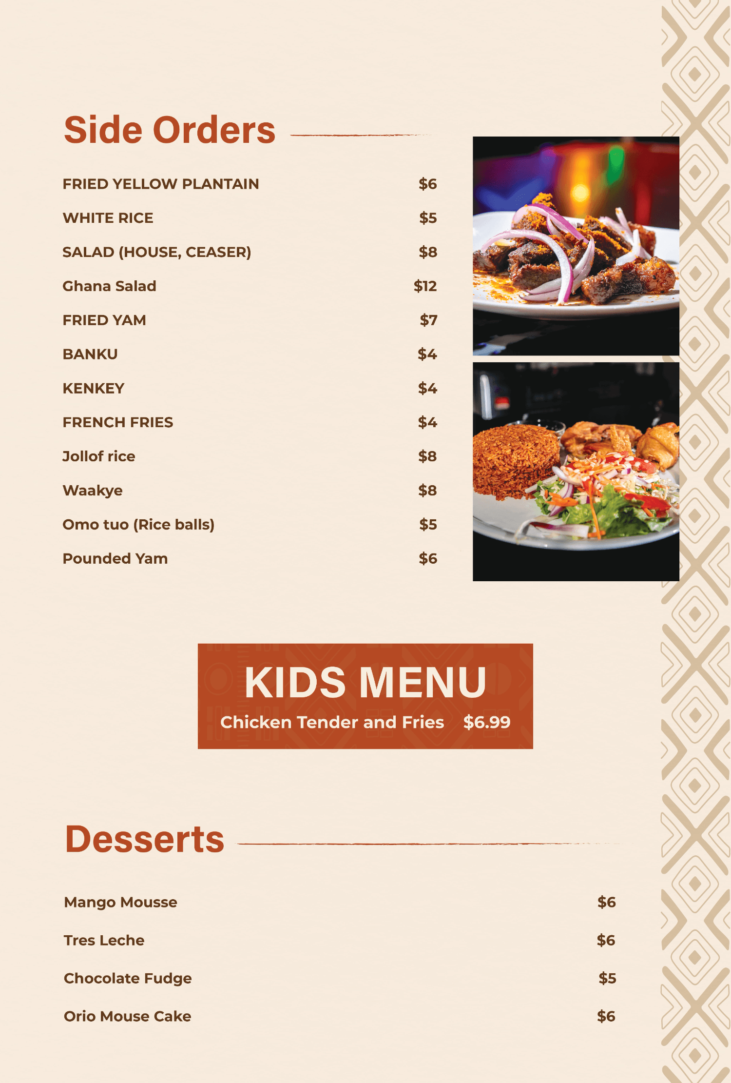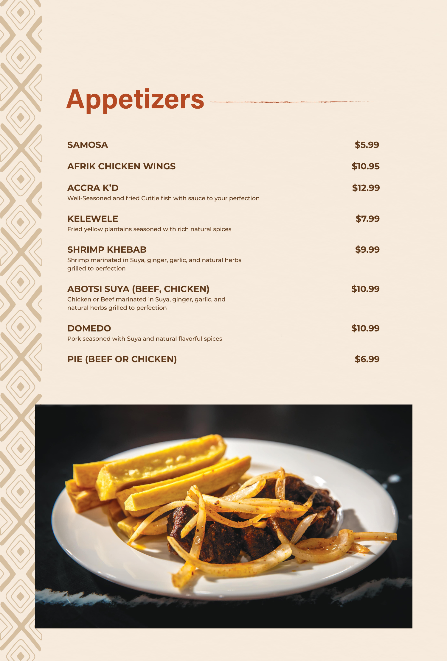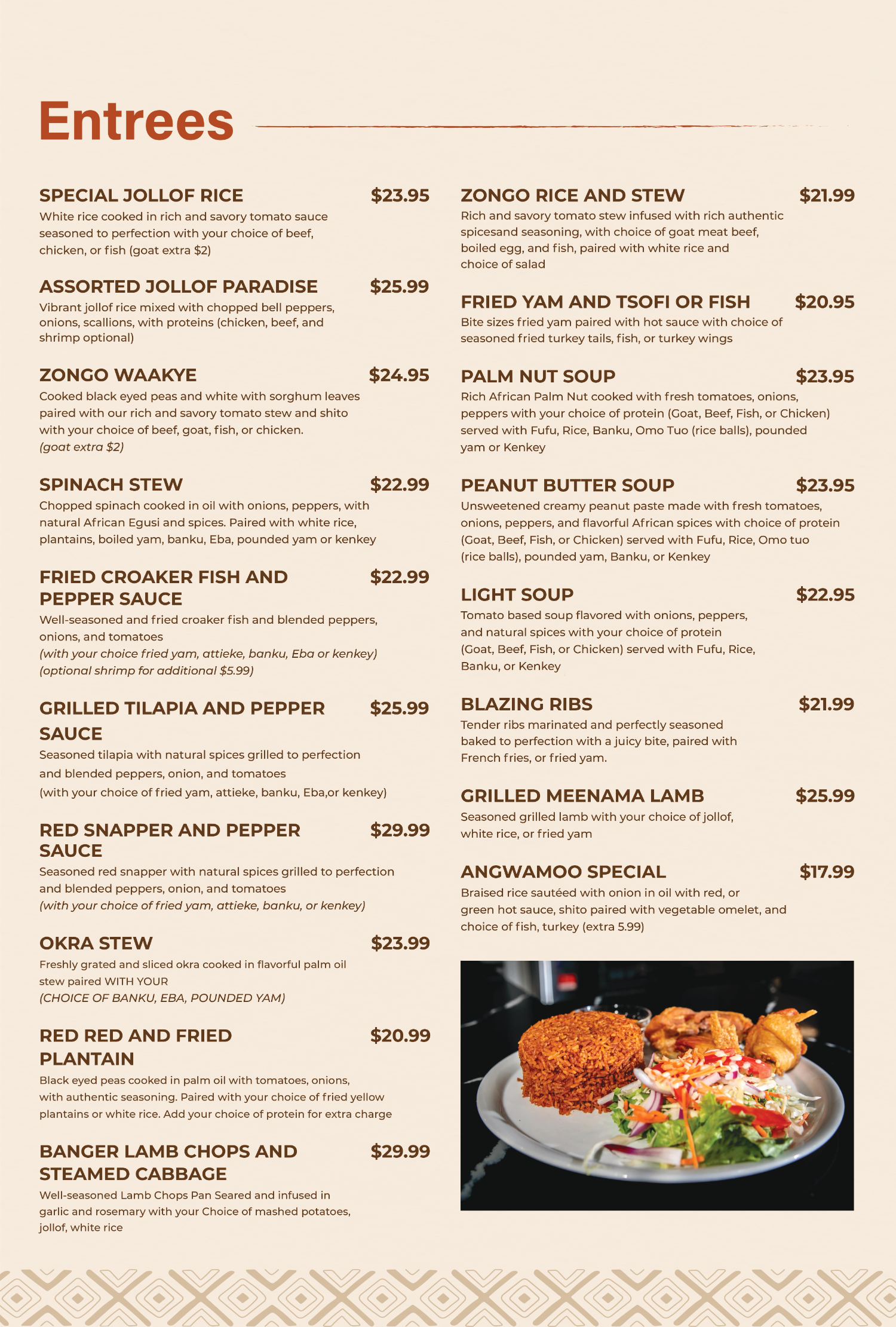 We are dedicated to creating a memorable dining experience where guests can savor the rich traditions, bold spices, and vibrant ingredients that define African cuisine and beyond. Our restaurant is more than just a place to eat; it is a place where people can come together to celebrate the beauty and divisive of the Afro heritage.